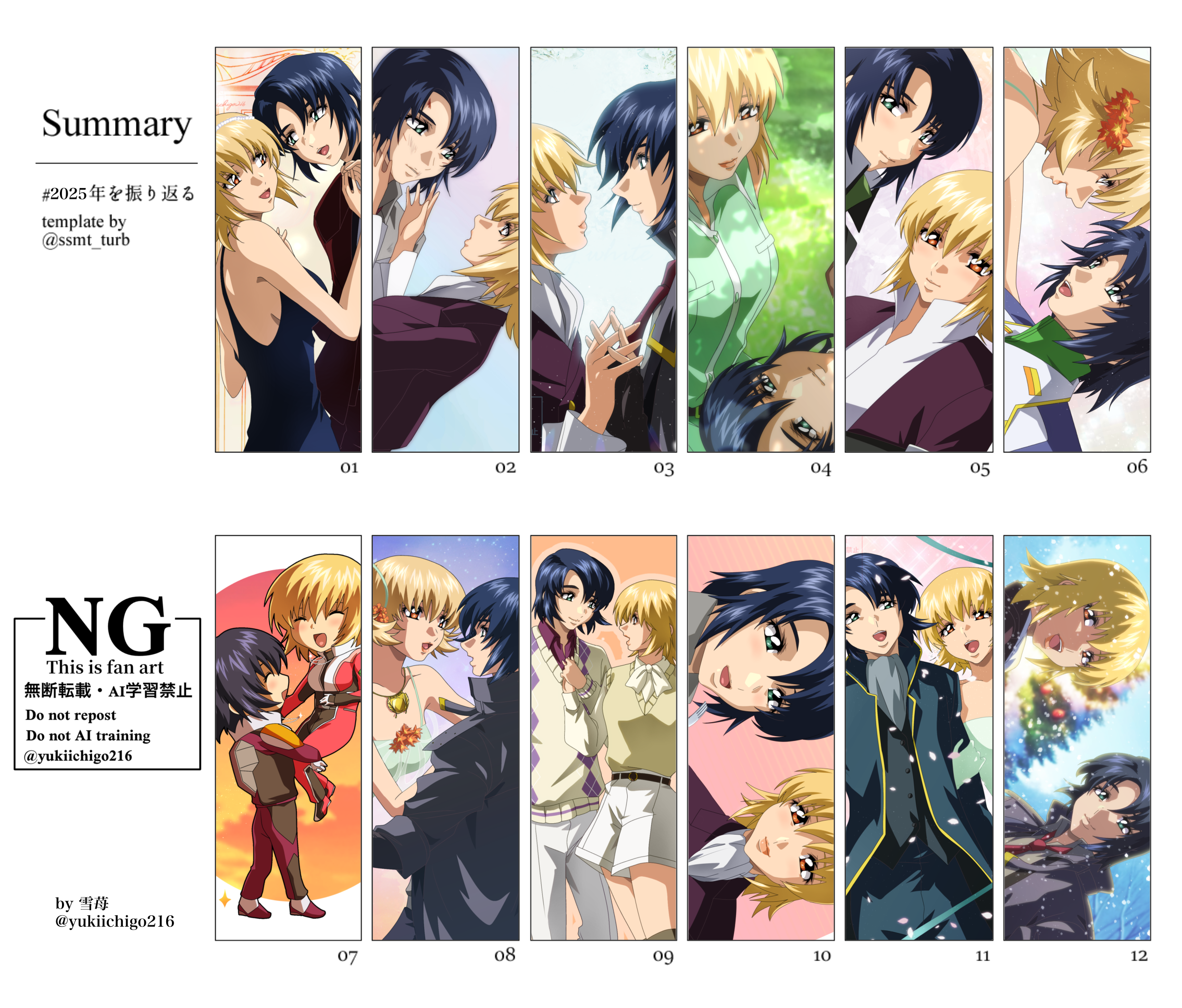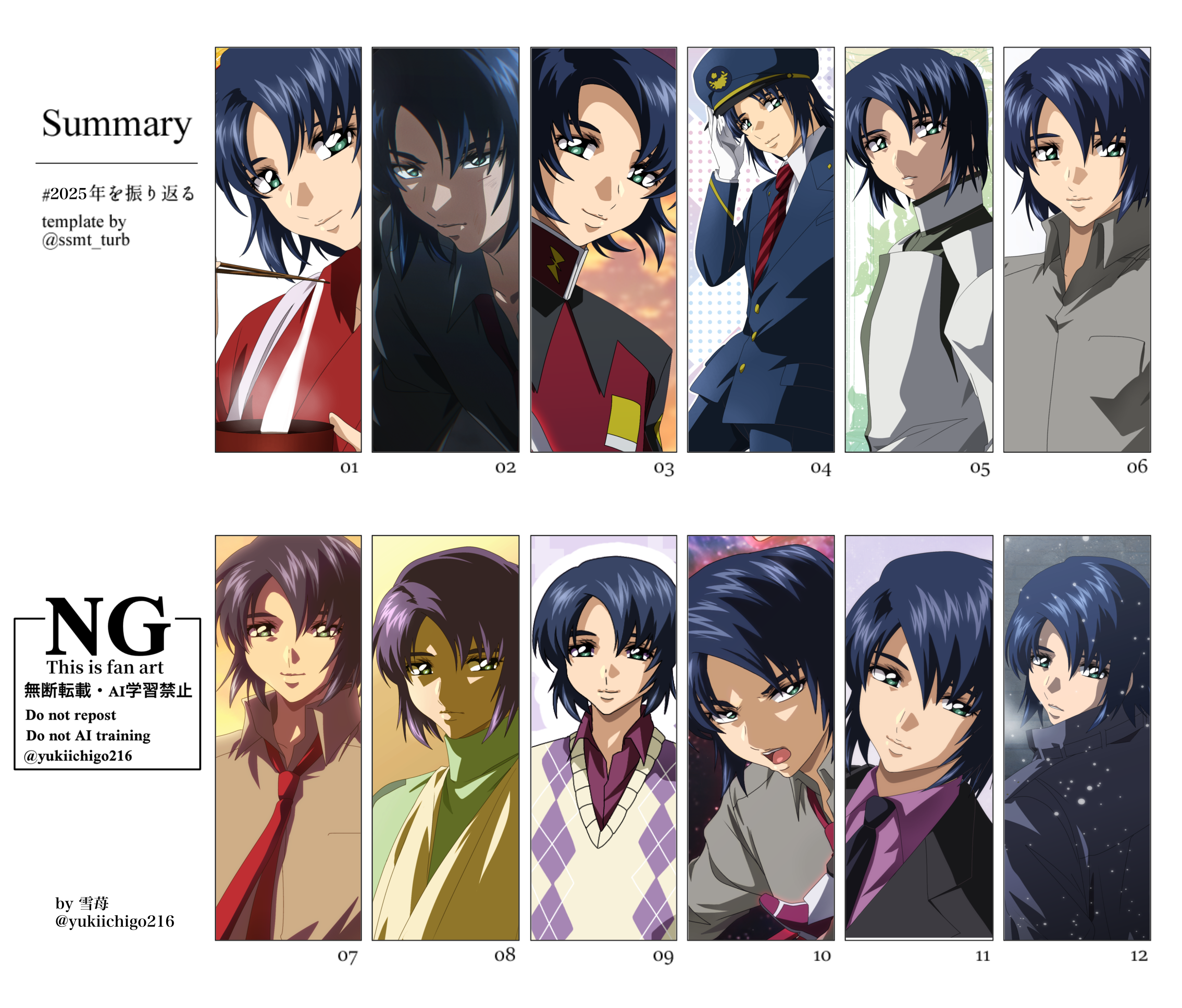 20251229(月)21:40コメントする ( 2 )ギャラリーに載せるほどでもないのでブログに掲載しますが、今年1月から12月までのアスカガのイラストを並べました。毎年やってたので今年も振り返りのために作ってみましたが、選ぶときに色々迷うくらい本当にたくさん描いてるな〜と改めて😂✨